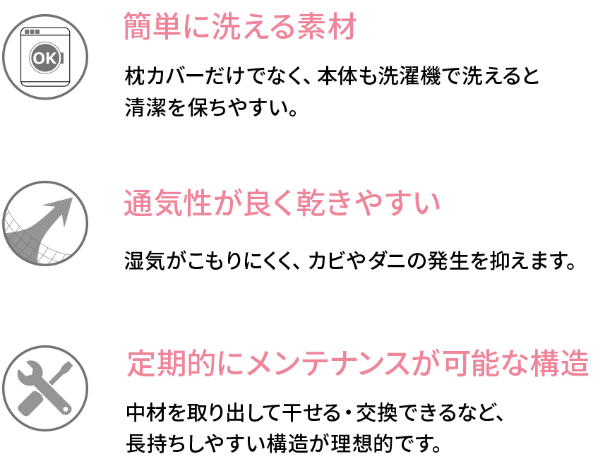 3つ目に重要なのが「枕のメンテナンス性」です。 お手入れがしにくいと、衛生面の不安や寝心地の低下の原因になります。