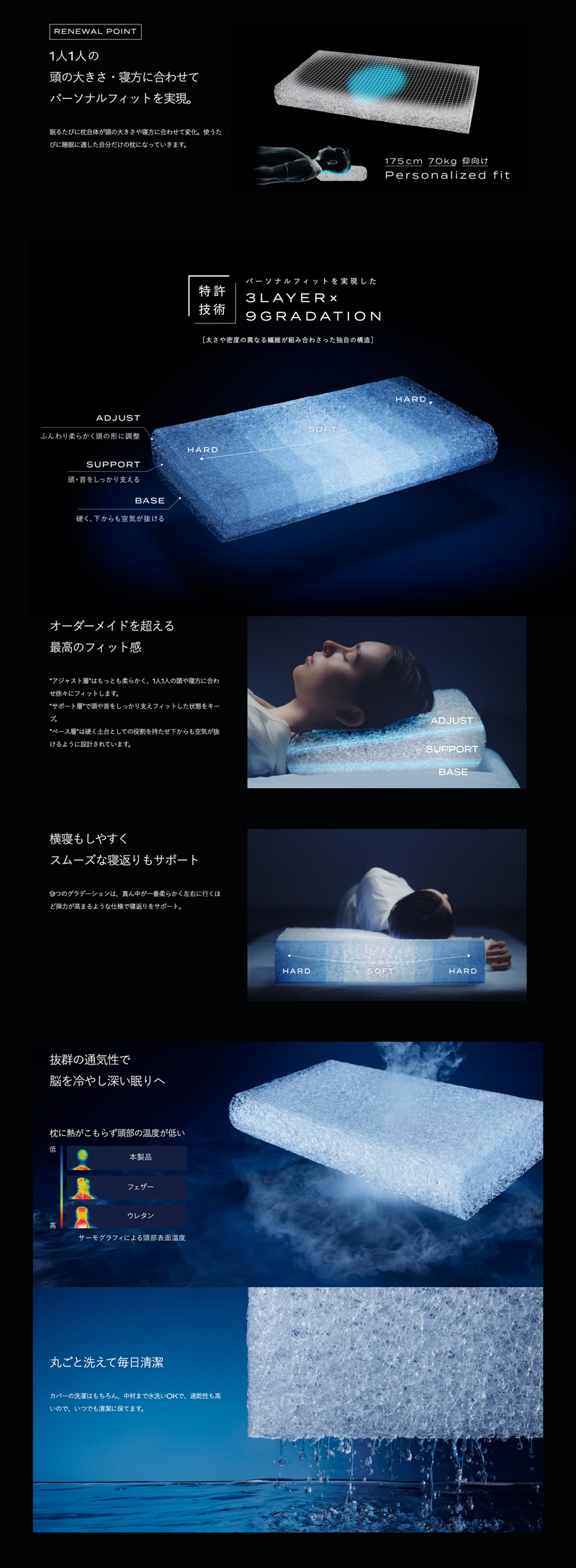 | フィット感 | 頭の大きさ・寝方に合わせてパーソナルフィットする3層9グラデーション構造を特許技術で実現。 |